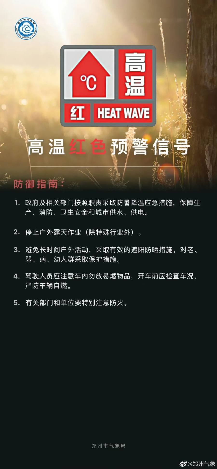郑州市气象台今日继续发布高温红色预警信号