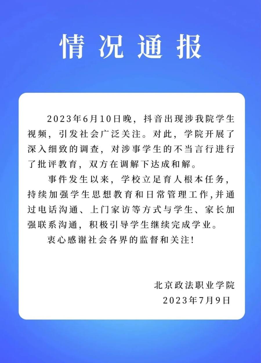 “大兴公安”微信公号消息,针对6月9日北京政法职业学院学生因琐事纠纷情况,大兴警方接报警后,依法开展调查,对涉事学生及其同班级、同宿舍多名学生,相关辅导员、任课老师、学生家长等进行多次走访询问,并对学校监控视频进行了细致梳理查看,还原了事发起因及经过。鉴于相关情节轻微,且双方已达成和解,警方对当事学生进行了批评教育,并已将相关情况通报校方。