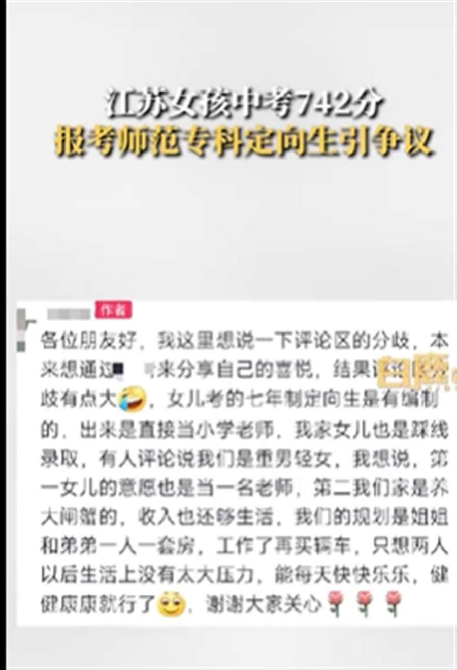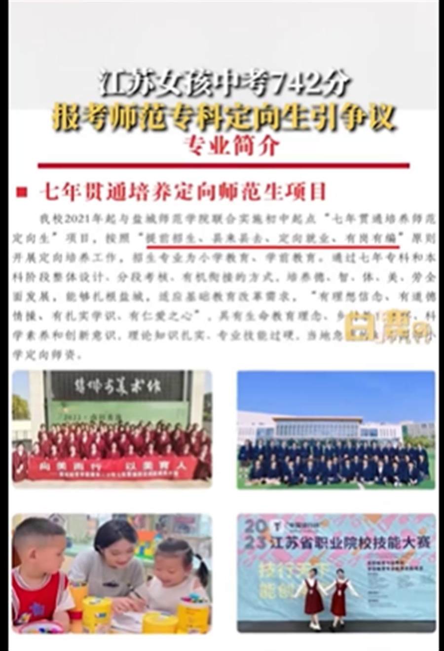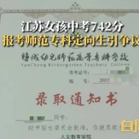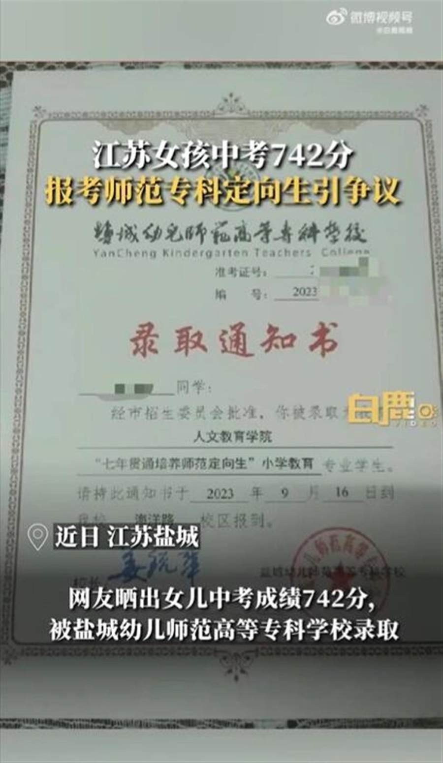 以742分的中考成绩,完全可以选择一所理想的高中就读,向大学梦想进军。但选择了“5+2”分段培养招生模式,报考盐城幼儿师范高等专科学校,如果一切如学生家长所言,定向生是有编制的,出来直接当小学老师,家里不缺钱,只希望孩子快乐生活,单从这个角度考虑,也不妨给以理解。