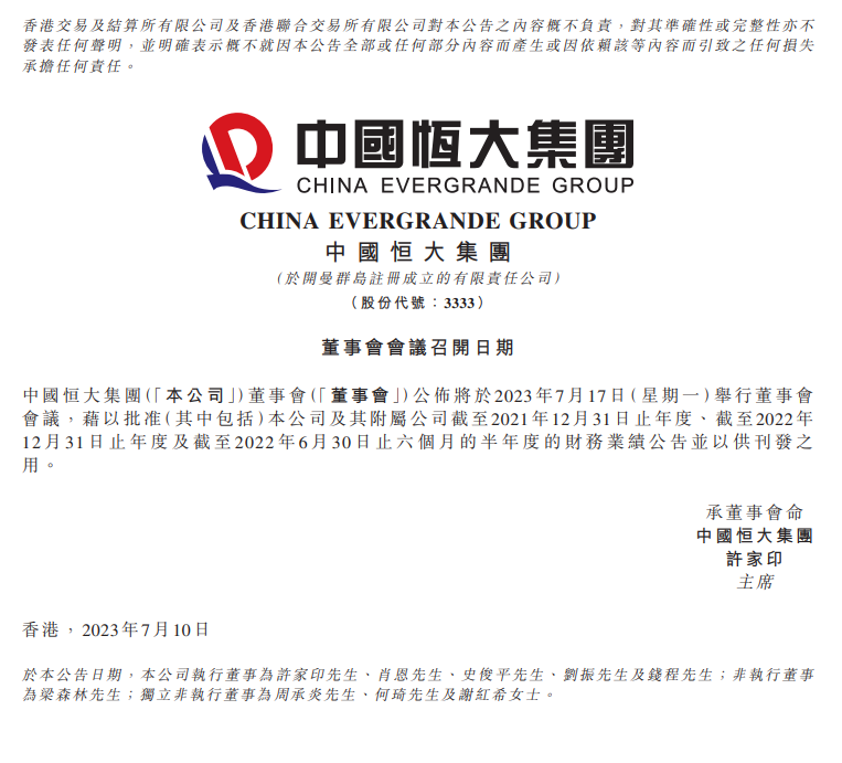 中国恒大公告,将于7月17日召开董事会会议,以批准公司及其附属公司截至2021年12月31日止年度、截至2022年12月31日止年度及截至2022年6月30日止六个月的半年度的财务业绩公告。