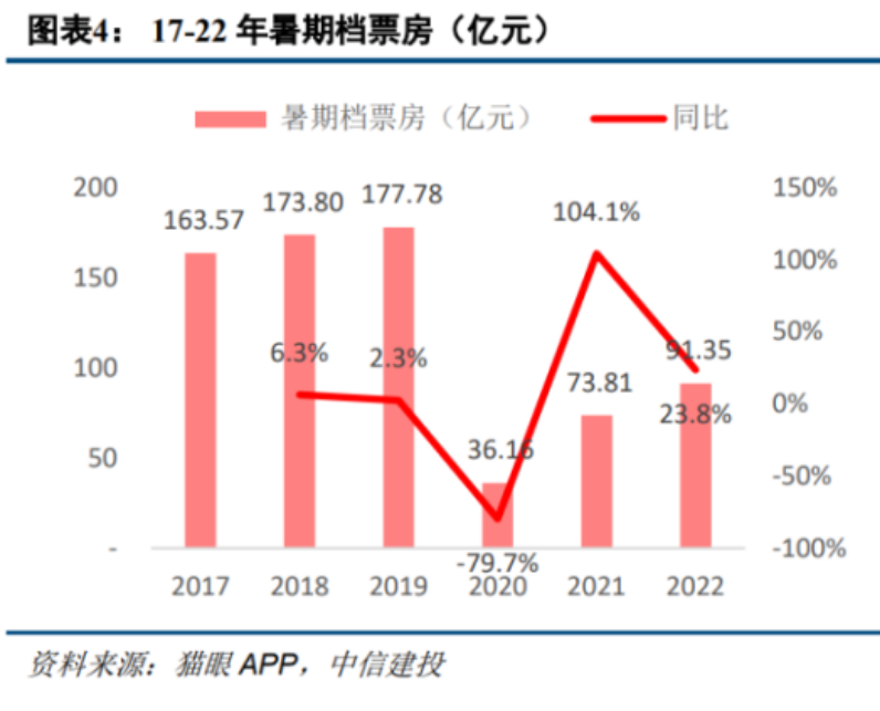 从观影人次看,暑期档也是重要档期,2019年暑期档观影人次达5.02亿,2021年为2.02亿,2022年为2.33亿。“尽管2023年春节后的恢复情况不及预期,但从今年暑期档的影片供给情况看,重磅影片供给充足。国产片已集齐沈腾、吴京、黄渤、王宝强等四大中国最具票房号召力的演员,同时还有《闪电侠》、《疯狂元素城》、《碟中谍7》等进口影片,重磅影片的充足供给有望带动观影人次恢复。”中信建投传媒首席分析师杨艾莉表示。