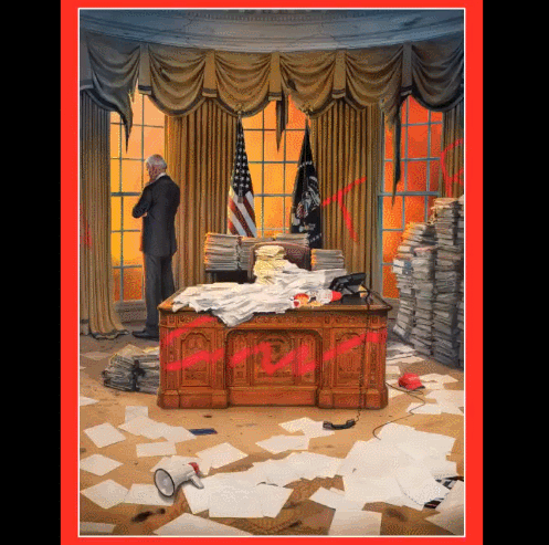 长达15秒的动画视频显示,拜登站在白宫办公室,窗外不时有火光显现,而他身后的文件积压如山,还有不少纸张散落一地,场面一片混乱。《时代周刊》在封面上还写着“第一天”(Day One)的字样,以此显示拜登就职总统后第一天所面临的混乱局面。