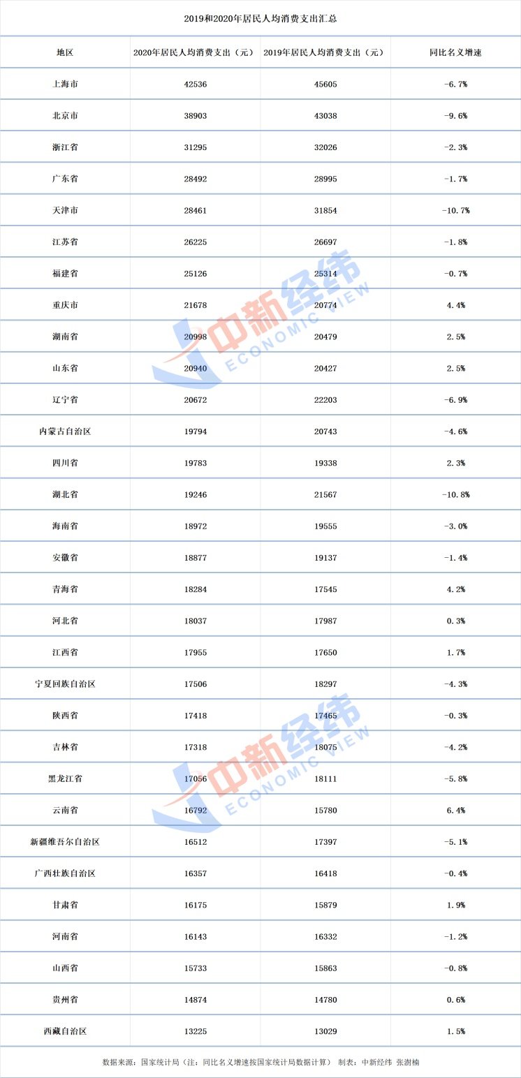 (原题为《31省份2020年人均消费榜:上海最能花 食品烟酒支出大》)