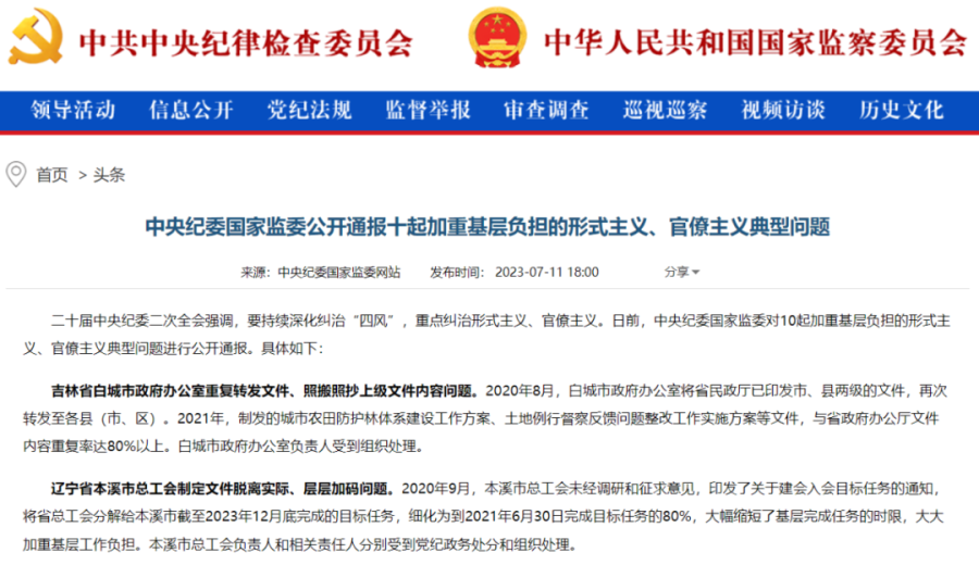 某地文件重复率达80%?中央纪委网站:动真碰硬纠治形式主义