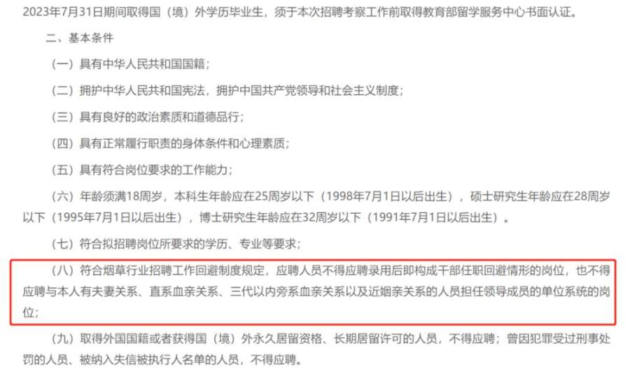 记者进一步发现,该回避要求并非今年首次出现,以山东烟草局为例,该公司2022年高校毕业生招聘公告就要求应聘者符合烟草行业招聘工作回避制度规定,应聘人员不得应聘录用后即构成干部任职回避情形的岗位,也不得应聘与本人有夫妻关系、直系血亲关系、三代以内旁系血亲关系以及近姻亲关系的人员担任领导成员的单位系统的岗位。