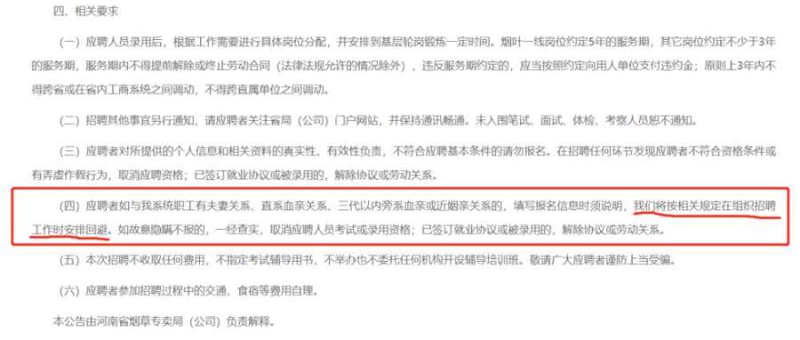 河南省烟草专卖局也提出了任职回避要求,不过在其相关要求中提到:应聘者如与我系统职工有夫妻关系、直系血亲关系、三代以内旁系血亲或近姻亲关系的,填写报名信息时须说明,我们将按相关规定在组织招聘工作时安排回避。