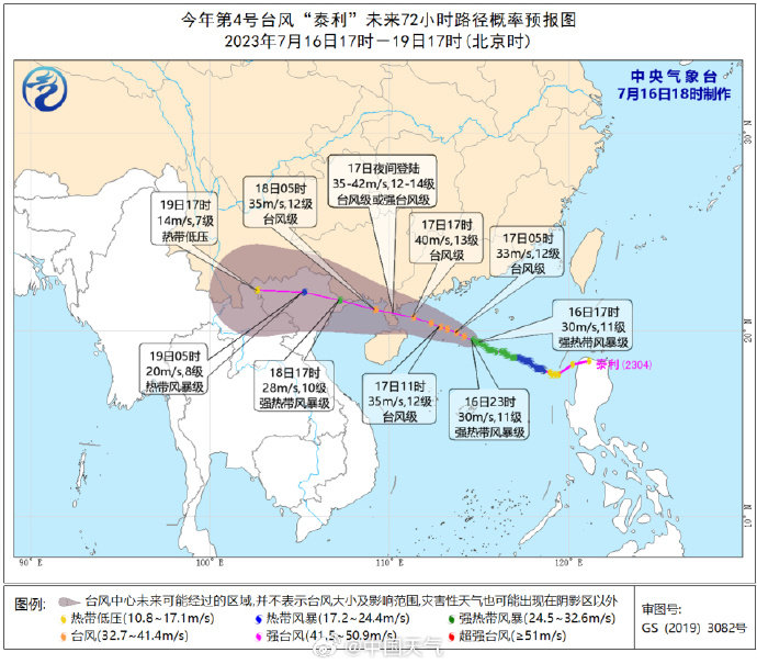 随着台风步步逼近,我国华南部分地区和南部海区强风雨天气陆续显现并持续。预计7月16日至19日,华南中南部、云南南部以及江南东部和南部等地的部分地区有大雨或暴雨,其中广东南部、广西南部、海南岛和云南东南部等地的部分地区有大暴雨,局地特大暴雨。同时,南海北部、琼州海峡、北部湾将有8~10级大风,其中南海西北部的部分海域风力可达11~14级、阵风15~16级;海南岛、广东西南部沿海、广西南部沿海等地有8~11级大风,广东西南部和海南岛东北部沿海局地可达12~14级。