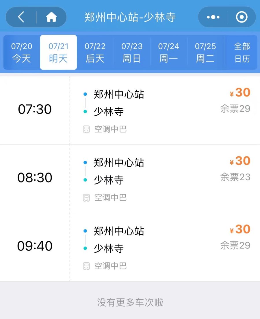 交通攻略:可从郑州直接乘坐去往少林寺的大巴车,一天共三班,可在微信上搜索“豫州行”,进入小程序“豫州行汽车票城际拼车快车预订”,搜索“郑州中心站-少林寺”即可订票。