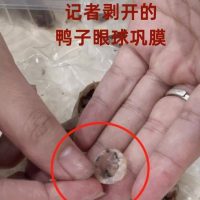 另一家鸭子店的店员告诉记者,他们“斩鸭子”多年确实没注意过眼球部分是否有巩膜,并没发现过这个眼球巩膜会脱落。“可能个人在买鸭子回去烧汤做菜时,把头斩开的情况下,鸭头眼睛和巩膜会脱落。”