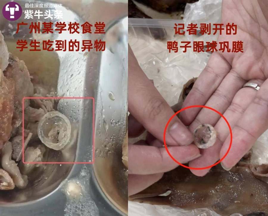 至于广州那家职业学校食堂食物中的物体是鸭子眼球巩膜还是其他异物,仅仅根据网传图片,并不能准确辨认。