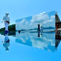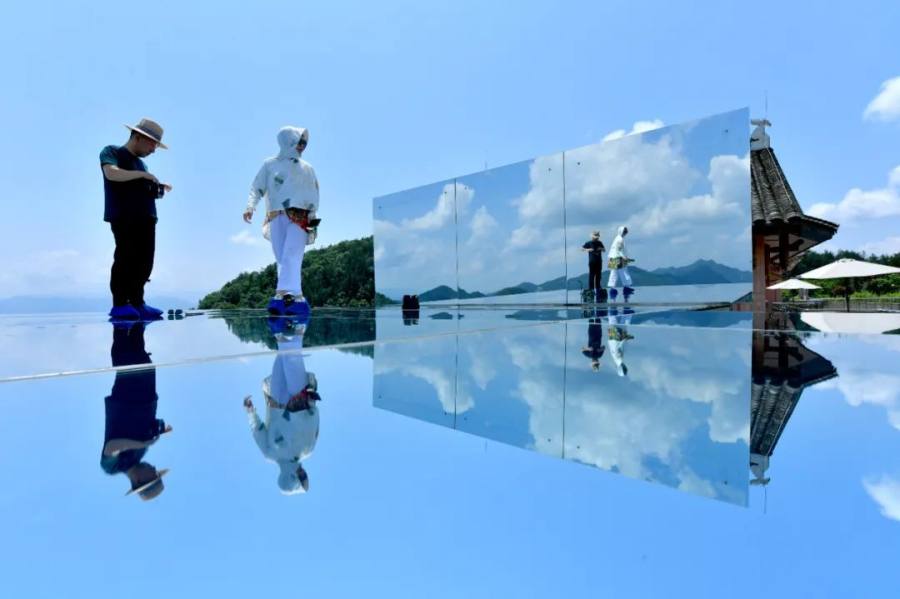6月25日,游客在宣恩县锣圈岩村一处乡村民宿的“天空之镜”景点游玩。新华社发(宋文摄)