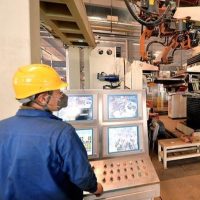 资料图:车间内工作人员进行机器操作。中新社记者 李佩珊 摄