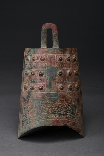 郑州博物馆馆藏的这件卷云纹铜钮钟,是1997年在新郑郑韩故城出土的整套编钟之一。钮钟体似合瓦,上部为梯形纽,平舞,铣微侈,于微凹;钟面两侧有螺形枚36个,行列整齐,对称分布于钲两侧;鼓、钲、篆、枚各部位均以阴线框相隔,篆饰云纹,鼓部饰云纹和三角纹。钮钟与镈钟共同组成了一套完整的编钟。