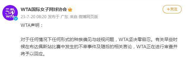 7月20日,@WTA国际女子网球协会 发文回应张帅事件:“对于任何情况下任何形式的种族偏见与歧视问题,WTA坚决零容忍。有关早些时候在布达佩斯站比赛中发生的不幸事件及随后的相关言论,WTA正在进行审查并将予以回应。 ”
