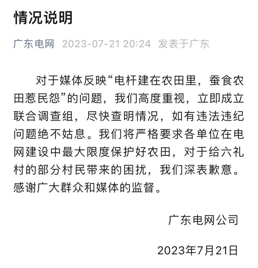 针对媒体反映的“电杆建在农田里,蚕食农田惹民怨”相关问题,广东电网公司7月21日晚发布情况说明,称对此“高度重视,立即成立联合调查组,尽快查明情况,如有违法违纪问题绝不姑息。”