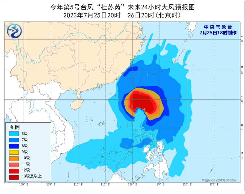 预计, 7月26日,巴士海峡、台湾以东洋面、南海东部和南部海域、台湾海峡、台湾岛及其沿海、福建沿海将有6至8级风、阵风9至10级,其中巴士海峡、南海东北部偏东海域、南海中东部偏东海域风力可达9至12级、阵风13至15级,台风中心经过的附近海域风力可达13至17级,阵风17级以上。