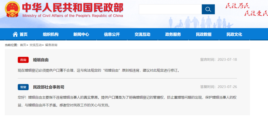 据民政部网站显示,有网民7月18日留言称,现在婚姻登记必须提供户口簿不合理,这与宪法规定的“结婚自由”原则相违背,建议对此规定进行修订。