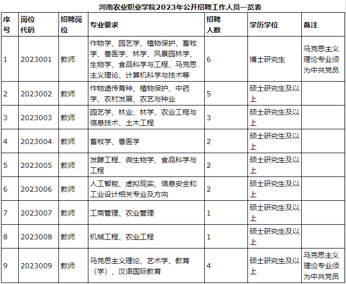 更多招聘公告详细内容请参考>>>河南农业职业学院2023年公开招聘工作人员方案