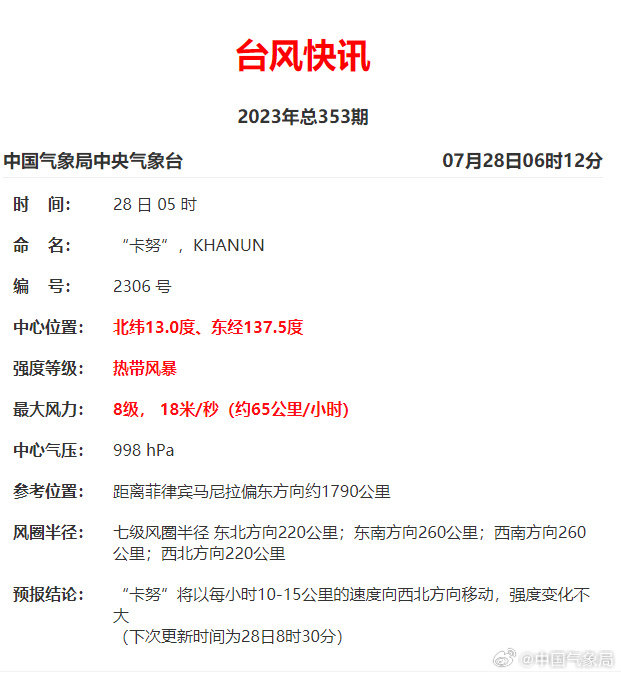 7月28日凌晨今年第6号台风“卡努”(Khanun)正式编号。