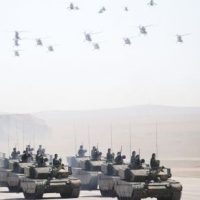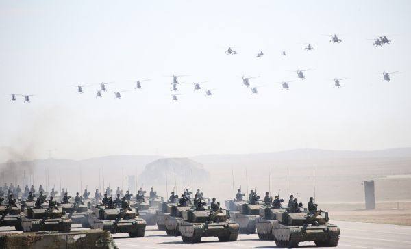2017年7月30日,在朱日和训练基地举行的建军90周年阅兵式上,解放军展示坦克方队和空中突击梯队。 新华社 发