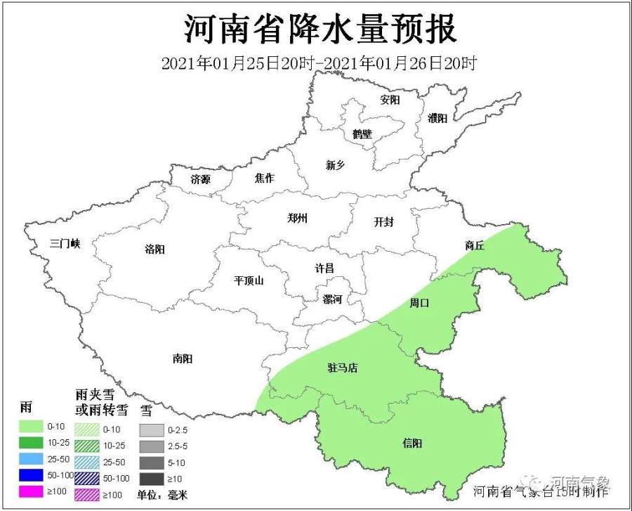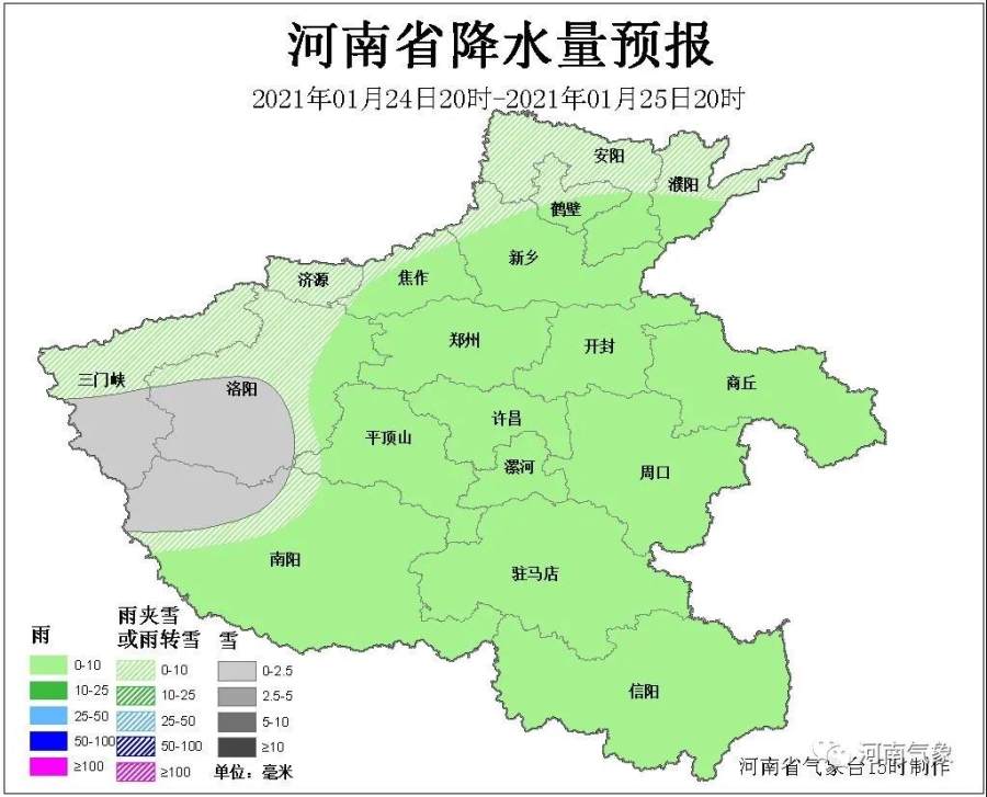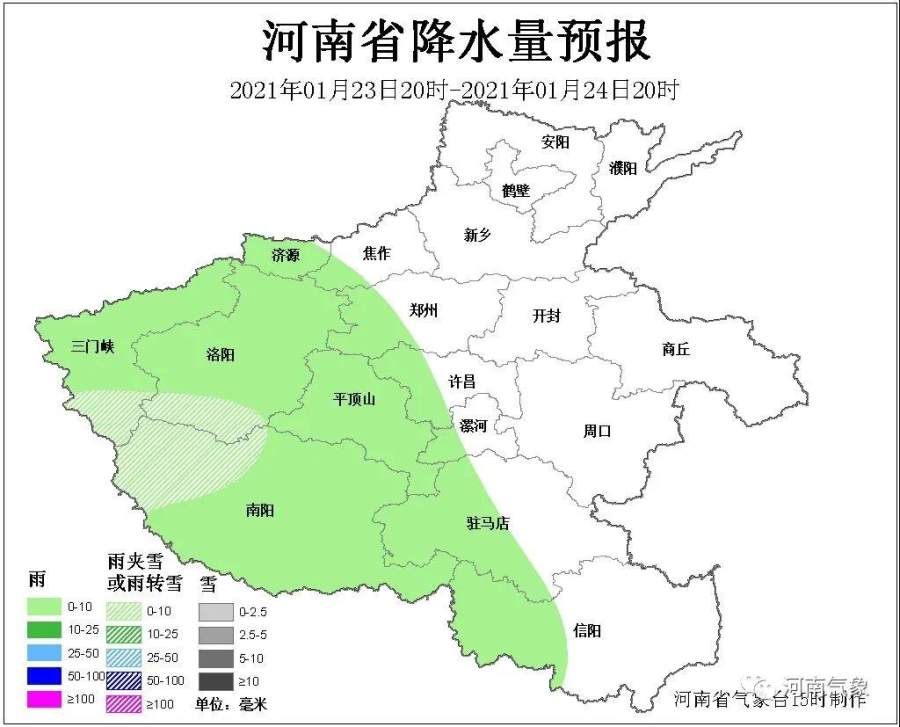 济源、三门峡、洛阳、平顶山、南阳五地区和郑州、许昌、漯河、驻马店、信阳五地区西部阴天,部分地区有小雨,高海拔山区有雨夹雪。