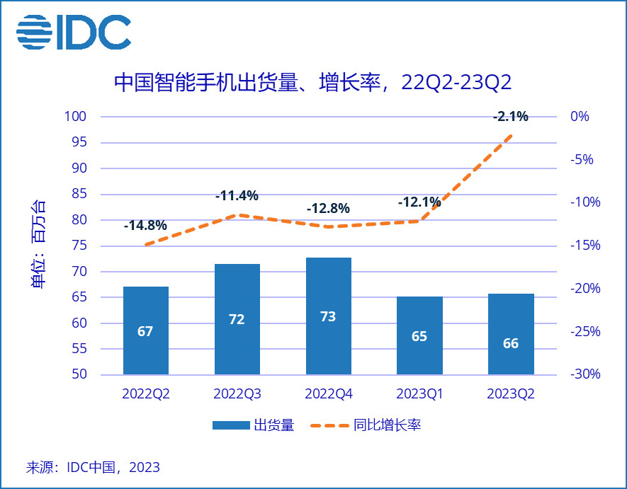 近日发布的国际数据公司(IDC)手机季度跟踪报告显示,2023年第二季度,中国智能手机市场出货量约6570万台,同比下降2.1%,降幅明显收窄。上半年出货量约1.3亿台,同比下降7.4%。OPPO以17.7%的市场份额在第二季度保持国内手机市场第一。
