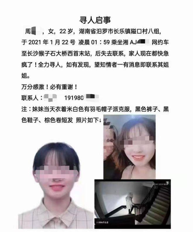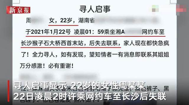 网传失联女生家属发布的《寻人启事》显示,22岁的周某某于2021年1月22号凌晨01 : 59乘坐一辆网约车,至湖南长沙猴子石大桥西首末站,后失去联系。文中描述她留着棕色卷短发,当天衣着米白色有羽毛帽子派克服,黑色裤子、黑色鞋子,并配有女生照片。“家人现在都快急疯了,全力寻人,如有发现,望知情者一有消息即联系其姐姐。”