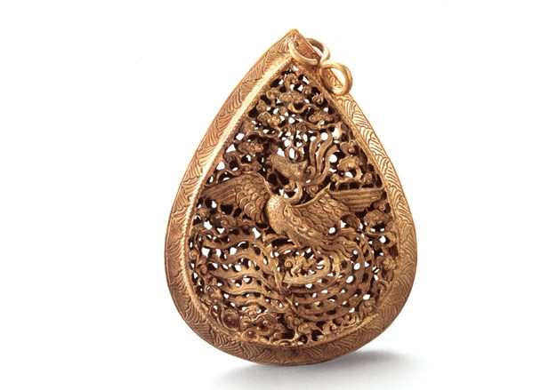 金凤纹帔坠,金器,明代前期文物,高10.4厘米,重66.1克。1970年河南省上蔡县明太祖朱元璋之孙顺阳王墓出土。现藏河南博物院。