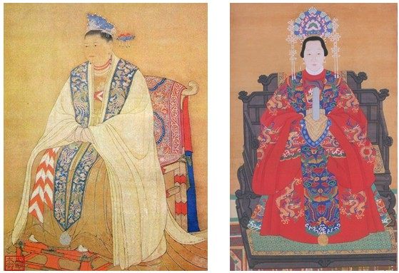 左:宋宣祖后画像中所佩霞帔角下系着的帔坠 右:明•朱佛女画像中所佩霞帔底端的帔坠
