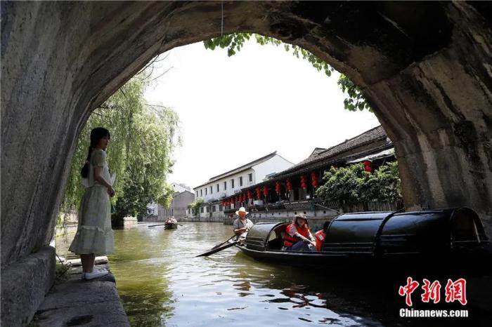 浙江绍兴,乌篷船从桥洞下穿过。作为中国首批24个历史文化名城,拥有2500多年建城史的绍兴是著名的水乡、桥乡。傅飞扬摄