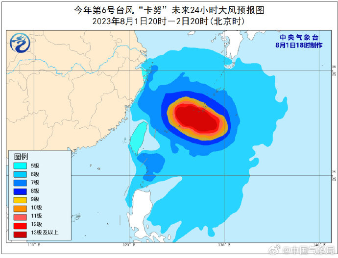 中央气象台预计,随着“卡努”逐渐靠近我国东部海域,8月1日20时至2日20时,东海南部海域、台湾以东洋面、巴士海峡、浙江近岸海域及沿海将有7级至8级、阵风9级至10级的大风,其中东海东南部部分海域将有9级至12级、阵风13级至14级大风;其中,“卡努”中心经过的附近海域风力可达13级至16级、阵风17级及以上。