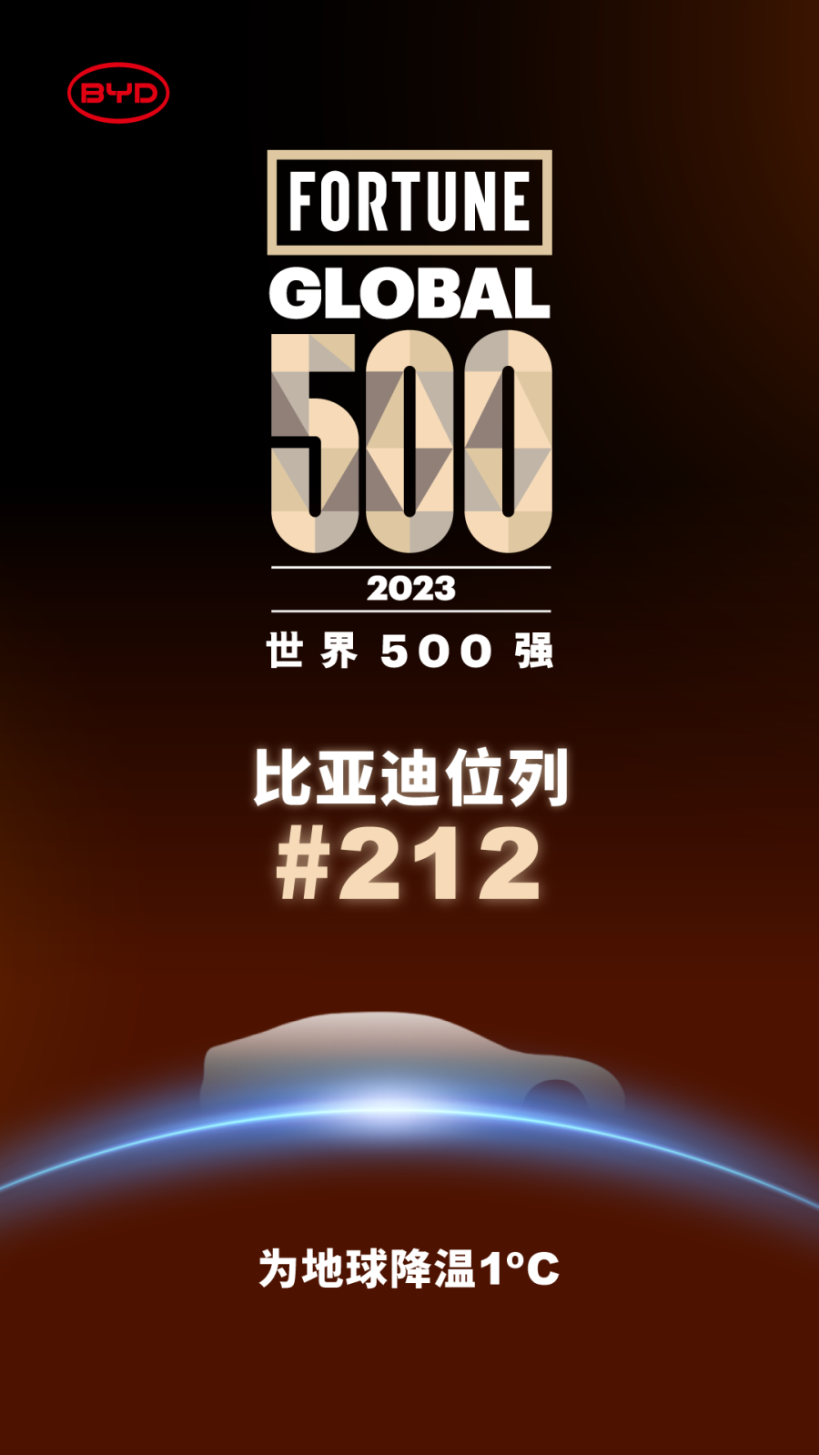 2023年8月2日,《财富》世界500强榜单全球发布,比亚迪位列第212位,排名较2022年上升224名,成为今年排名升幅最大的中国企业。