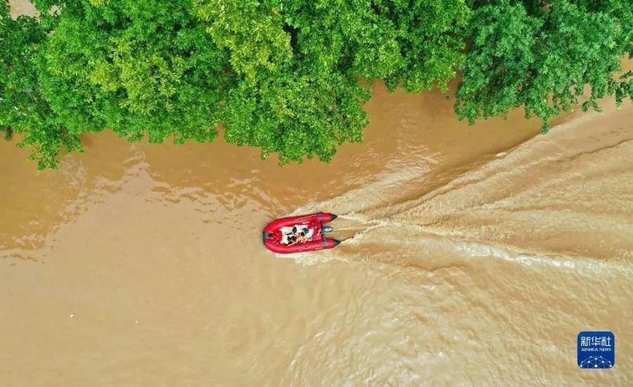 救援人员在河北省涿州市市区内驾驶冲锋舟转移群众 图片来源:新华社