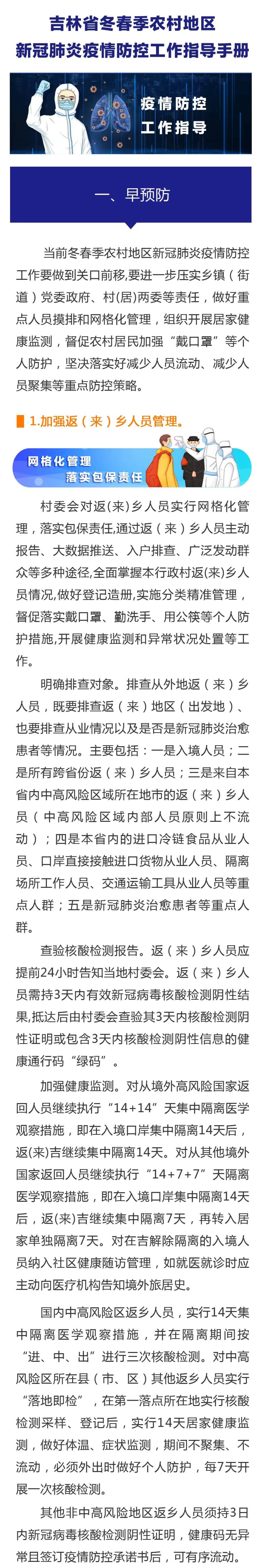 吉林卫生健康微信公号1月24日消息,吉林省冬春季农村地区新冠肺炎疫情防控工作指导手册印发,指出返乡人员需持3天内核酸阴性报告。全文如下: