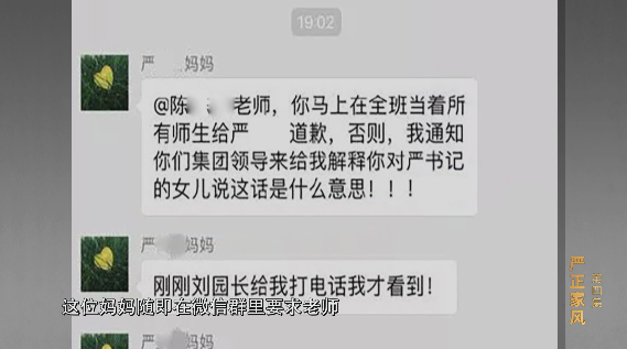 这位妈妈随即在微信群里要求老师马上当着所有师生给女儿道歉,并表示:“否则,我通知你们集团领导来给我解释,你对严书记的女儿说这话是什么意思?”