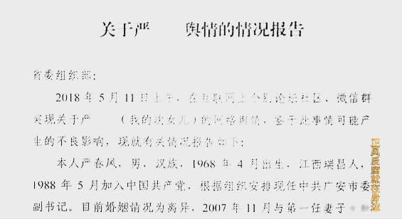 随后,严春风把这份写给省委组织部的情况报告私下发给了几个熟人帮忙把关,不料,一传十、十传百,报告也传到了网络上,反而让网友们确定了“严书记”就是他。网络舆论也很快演变成举报严春风的具体问题线索。四川省纪委监委发布通告表示,已关注到网友反映“严春风舆情”相关情况,已介入调查核实。