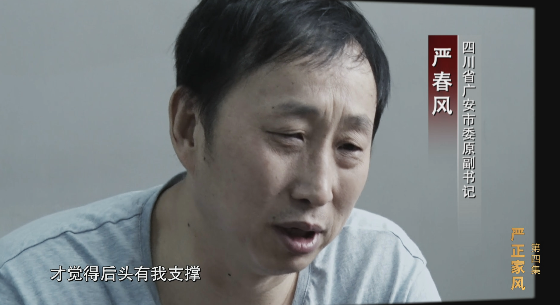 四川省广安市委原副书记 严春风:我是在养父母家长大,由于缺乏家庭和父母的爱,所以我从心里头有不安全感。我现在家庭两任妻子也都离婚了,我感觉到我是愧对我的家人,我的儿子没有父亲,我的女儿也没有父亲。