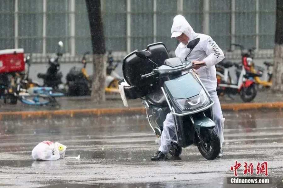 外卖员在雨中扶起倒地的电动车