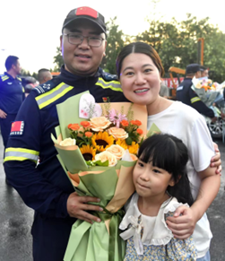 在欢迎仪式现场的迎接者中,有亲属迫不及待前来与救援队员团聚。郑州市中州应急救援队队员刘阳的家属刘南告诉正观新闻记者:“丈夫出发的时候有千言万语想对他说,但是时间紧迫,救援刻不容缓。他一向都很乐于助人,我为他感到骄傲。”刘阳的女儿说:“我知道爸爸这次是去救人,在我心里爸爸是最勇敢的人。”