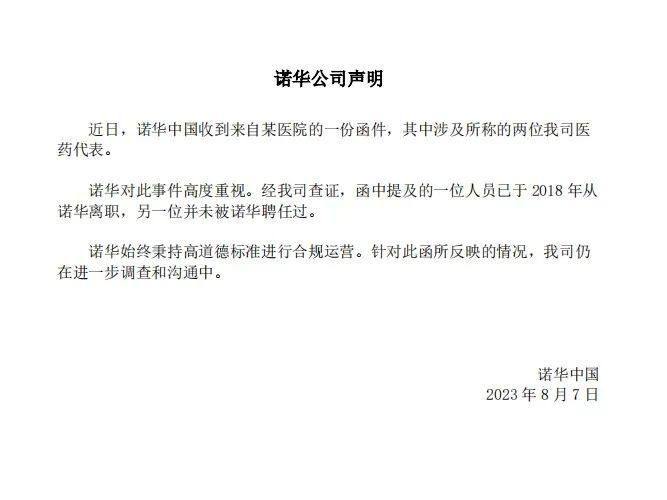 诺华表示对此事件高度重视,经查证,函中提及的一位人员已于2018年从诺华离职,另一位并未被诺华聘任过。