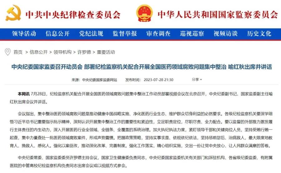 7月28日,纪检监察机关配合开展全国医药领域腐败问题集中整治工作动员部署视频会议在北京召开。会议指出,集中整治医药领域腐败问题是推动健康中国战略实施、净化医药行业生态、维护群众切身利益的必然要求。