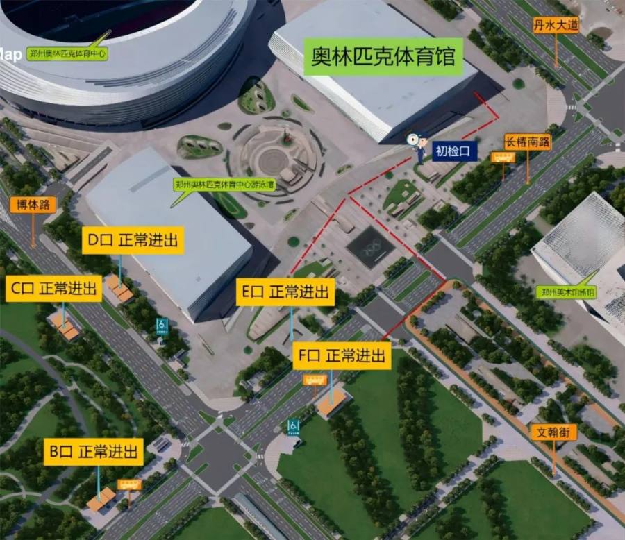 前往郑州奥林匹克体育中心体育馆的乘客,到达6/14号线奥体中心站,E/F口出站步行即可到达。