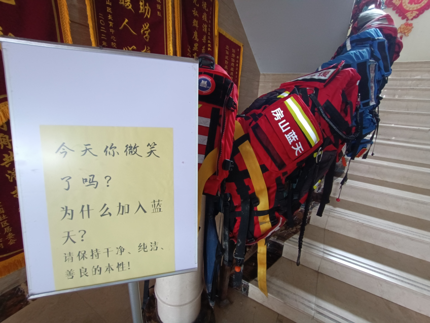 走进房山蓝天救援队,一面面鲜红的锦旗层层摞摞,挂满了楼道。一则立牌竖在过道和楼梯的交汇处。上面写着“为什么要加入蓝天,请保持干净、纯洁、善良的本性”。“不抽事主一根烟,不喝家属一口水”,是房山蓝天救援队坚持了多年的条例。