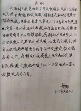 “拒绝接受捐款、捐物是我和双方亲属共同的意愿,更多的是遵从王宏春的生前意愿。”王宏春的爱人杨宏专门手写了一封信回应。“王宏春长期以来都以奉献和付出为己任,希望更多的、更需要的人获得帮助。感谢社会各界爱心人士对我爱人及其家庭的关爱,心意我们收下,物质上的捐助希望更多给予因洪灾遭受极大损失的人们。我想这也是我爱人王宏春的愿望”,杨宇写在信里写道。