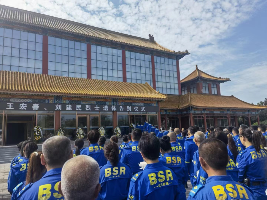 8月12日上午9时,北京房山蓝天救援队队员王宏春、刘建民遗体告别仪式在北京市房山区殡仪馆举行,除了亲友和许多蓝天救援队队员外,不少市民也自发赶来,送两位烈士最后一程。