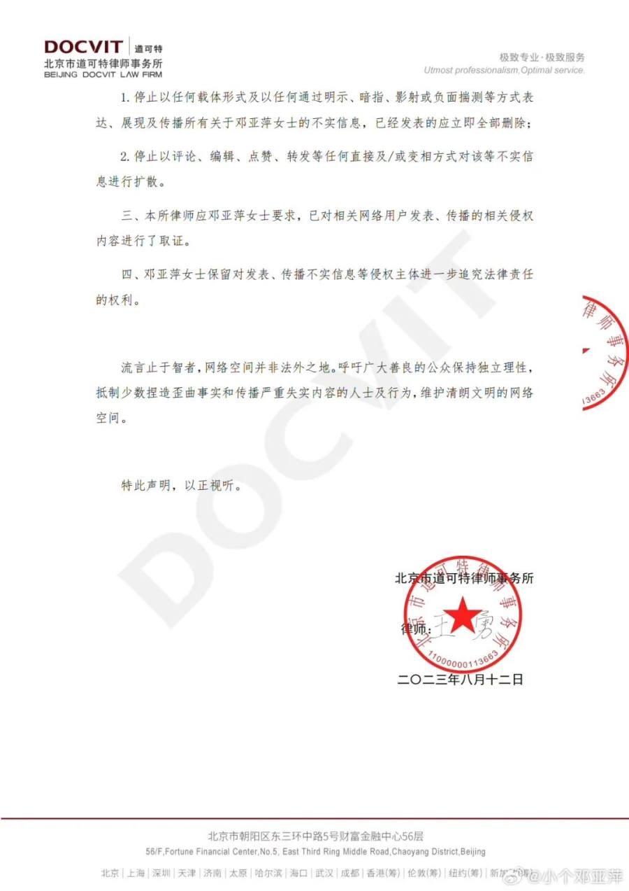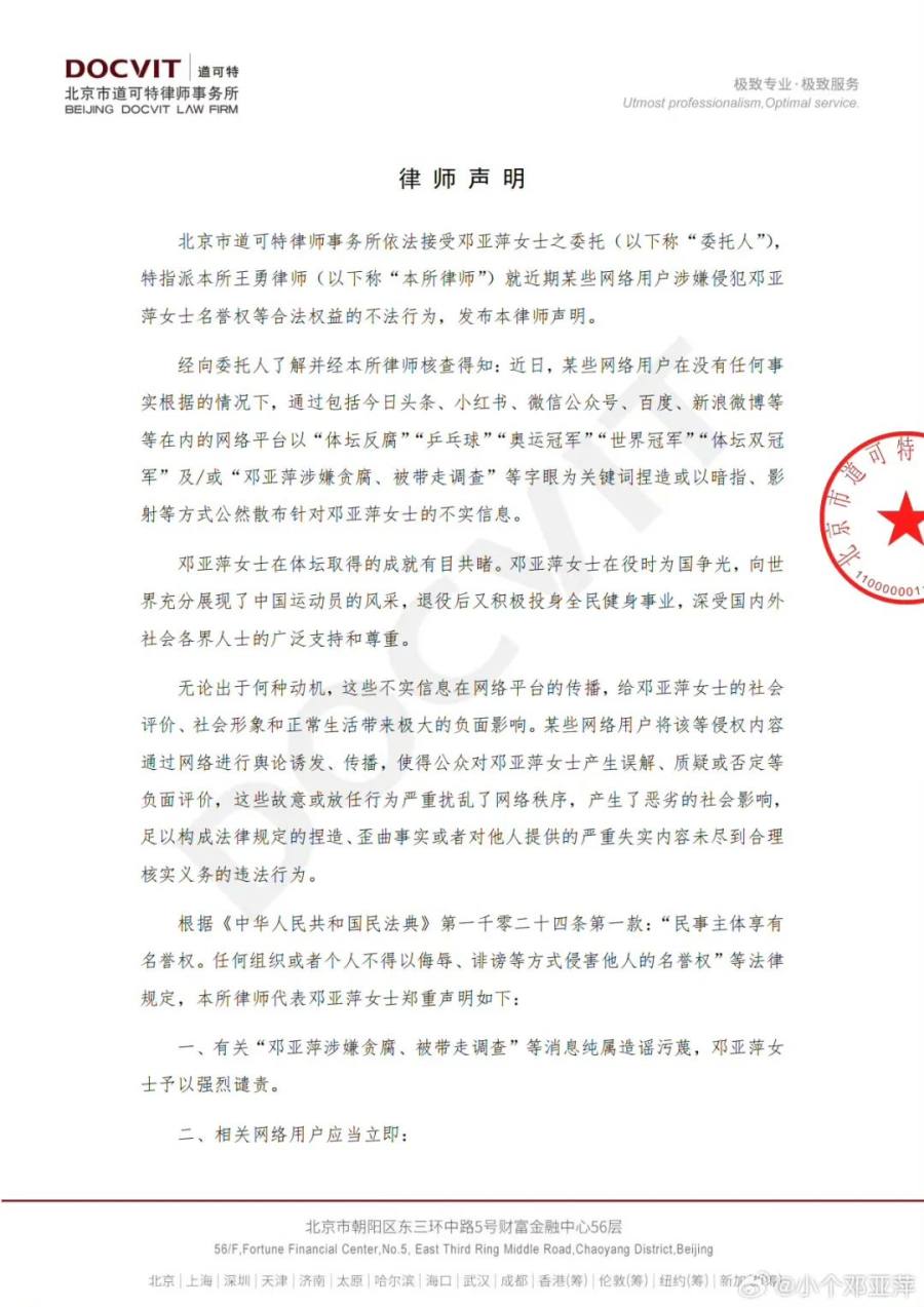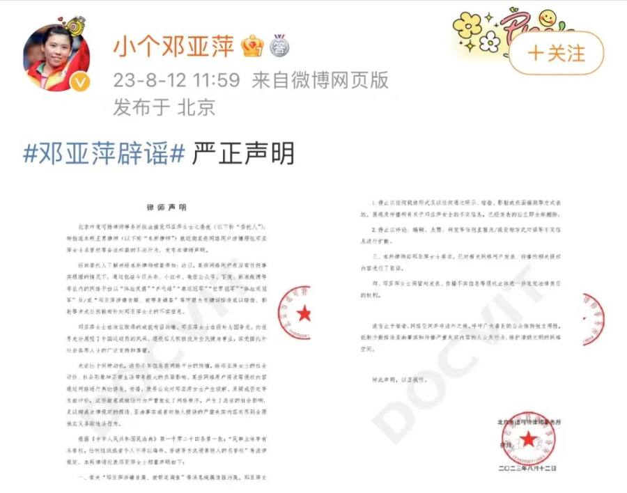 8月12日,“小个邓亚萍”微博发布律师声明辟谣。