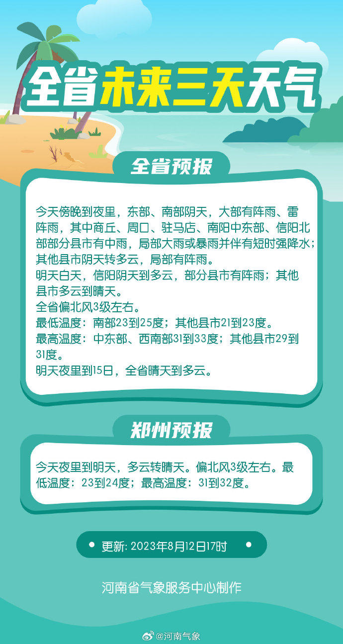 8月12日白天,全省阴天间多云,大部有阵雨、雷阵雨,雨量分布不均,其中黄河以北和郑州部分县市中到大雨,局部暴雨,伴有短时强降水、雷暴大风等强对流天气。12日夜里,商丘、周口、漯河、平顶山东部、南阳、驻马店、信阳阴天有小到中阵雨、雷阵雨,其中南阳东部、驻马店局部大雨或暴雨,伴有短时强降水、雷暴大风等强对流天气;其他县市多云。 全省西南风转西北风3级左右。 最高温度:西部、北中部29到31度;东南部35到37度;其他县市32到34度。 最低温度:东部、南部23到25度;其他县市21到23度。