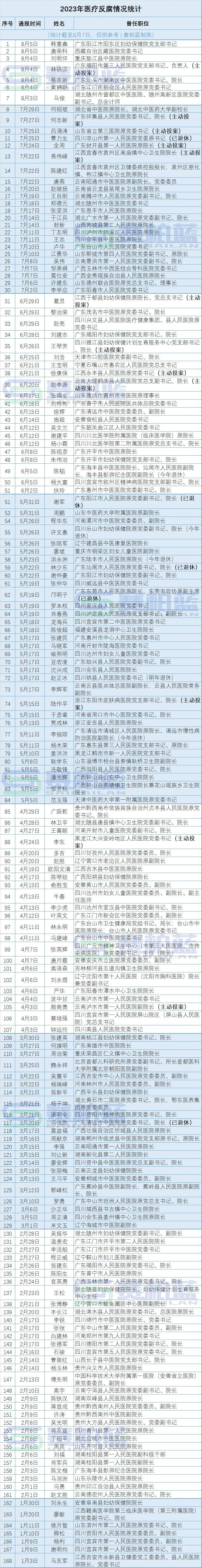稍早前,人民日报健康客户端引援赛柏蓝的统计数据显示,今年以来,截至8月6日,至少168位医院党委书记、院长被查。