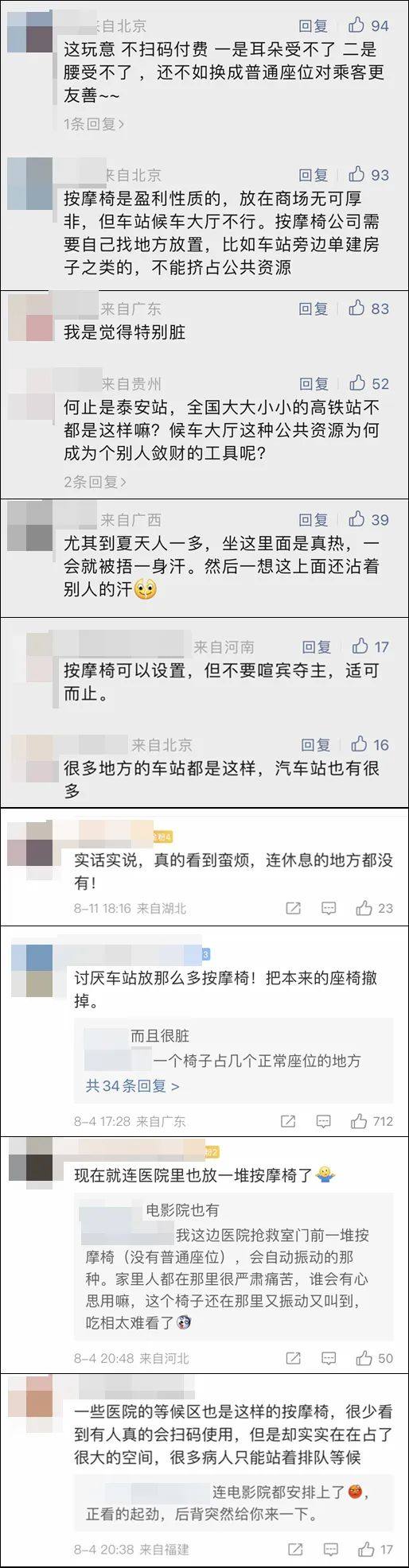 对此,自山东青岛的徐女士表示“不人性化。我认为普通座应该要多于按摩座,因为按摩椅相对宽大,占用面积比普通椅子多,多加一张按摩椅,就要撤掉相应的普通椅子,挤占的是公共候车资源”。