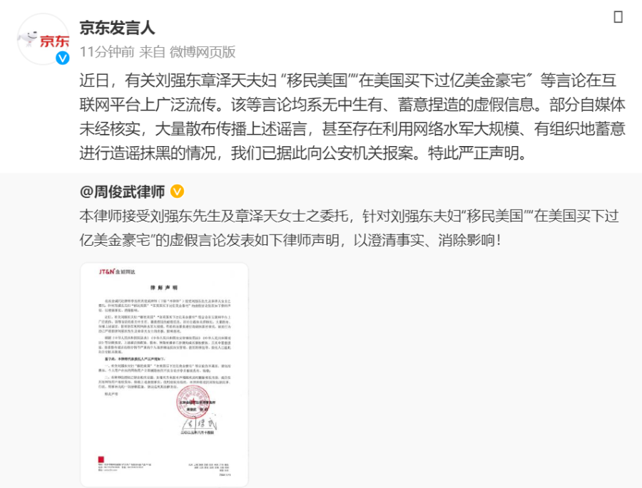 8月14日,@京东发言人 发布微博称,近日,有关刘强东章泽天夫妇 “移民美国”“在美国买下过亿美金豪宅〞等言论在互联网平台上广泛流传。该等言论均系无中生有、蓄意捏造的虚假信息。部分自媒体未经核实,大量散布传播上述谣言,甚至存在利用网络水军大规模、有组织地蓄意进行造谣抹黑的情况,我们已据此向公安机关报案。特此严正声明。